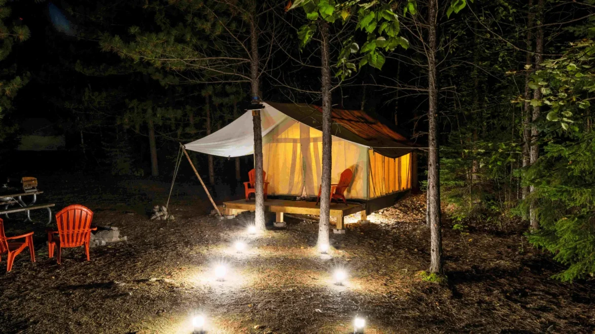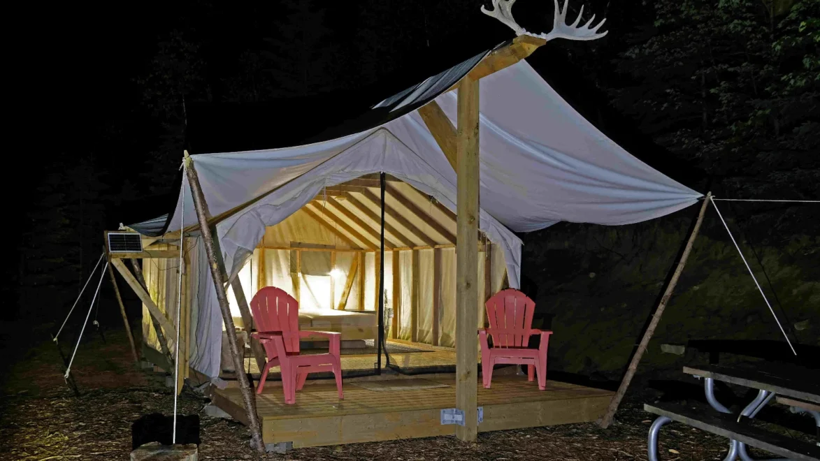 Experience an unforgettable stay at Four Corners Algonquin, just outside Algonquin Park’s East Gate in Whitney, Ontario. Our 90-acre, off-grid property offers a range of unique accommodations, including glamping tents, traditional camping sites, and tiny houses. We provide comfortable, hassle-free camping for all ages. Our glamping options—safari, pole, and bell tents—are fully erected and weatherproof, perfect for a cozy, dry stay. For those seeking a unique experience, our dark-sky-friendly site offers incredible views of the Milky Way, allowing you to enjoy mesmerizing campfire flames and stargazing. Whether you’re a self-reliant traveler, a family seeking a comfortable outdoor experience, or just need a fuss-free place to stay before a backcountry trip, we have the perfect spot for you. Enjoy the beauty of the Canadian Shield without the heavy lifting. Book your wilderness adventure today and connect with nature in comfort.