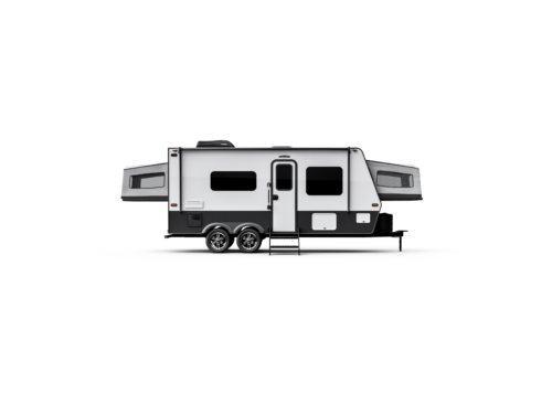 The hybrid travel trailer is a cross between a hard-sided travel trailer and a tent camping trailer.